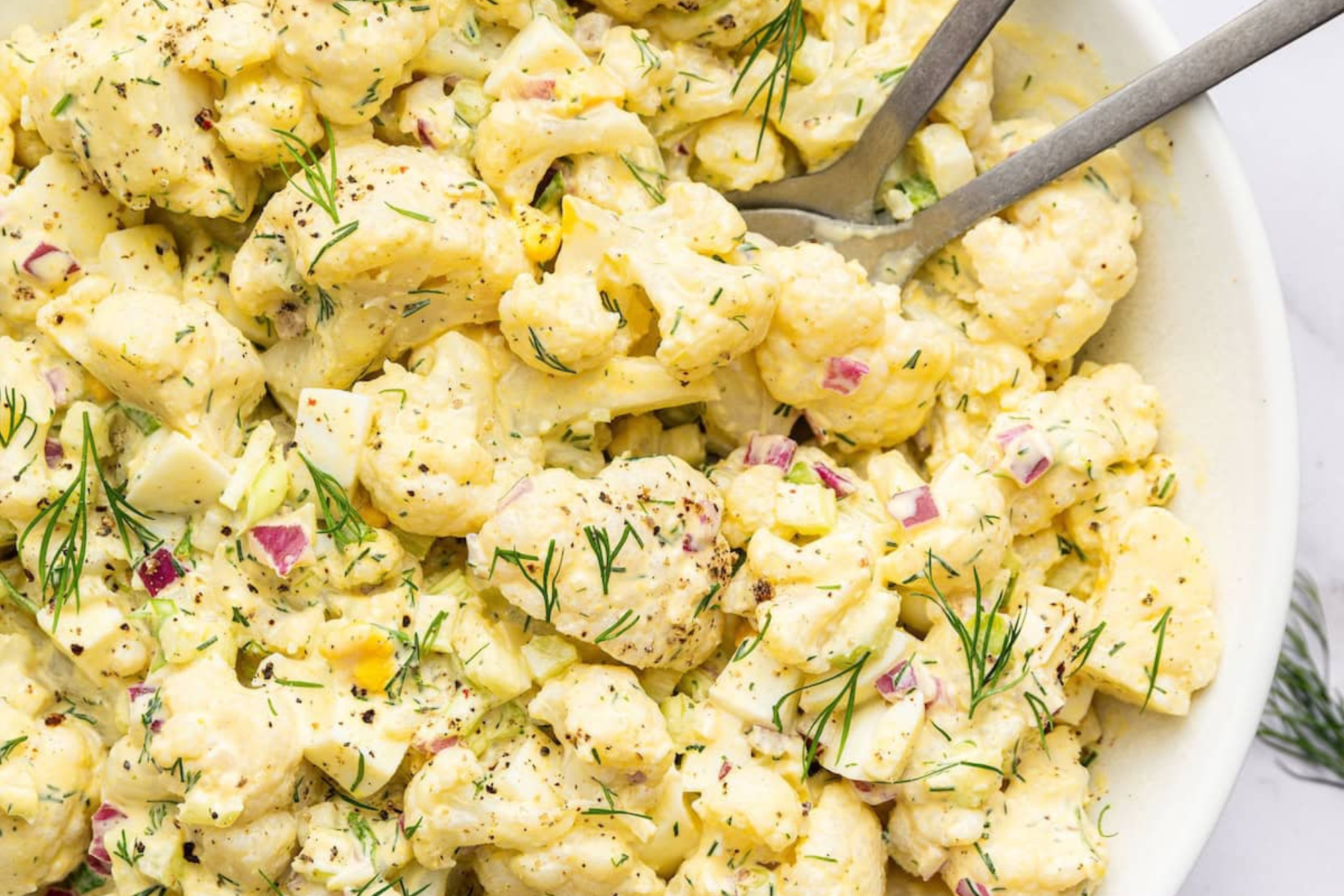 A light twist on potato salad — cauliflower florets dressed like the classic, creamy side.