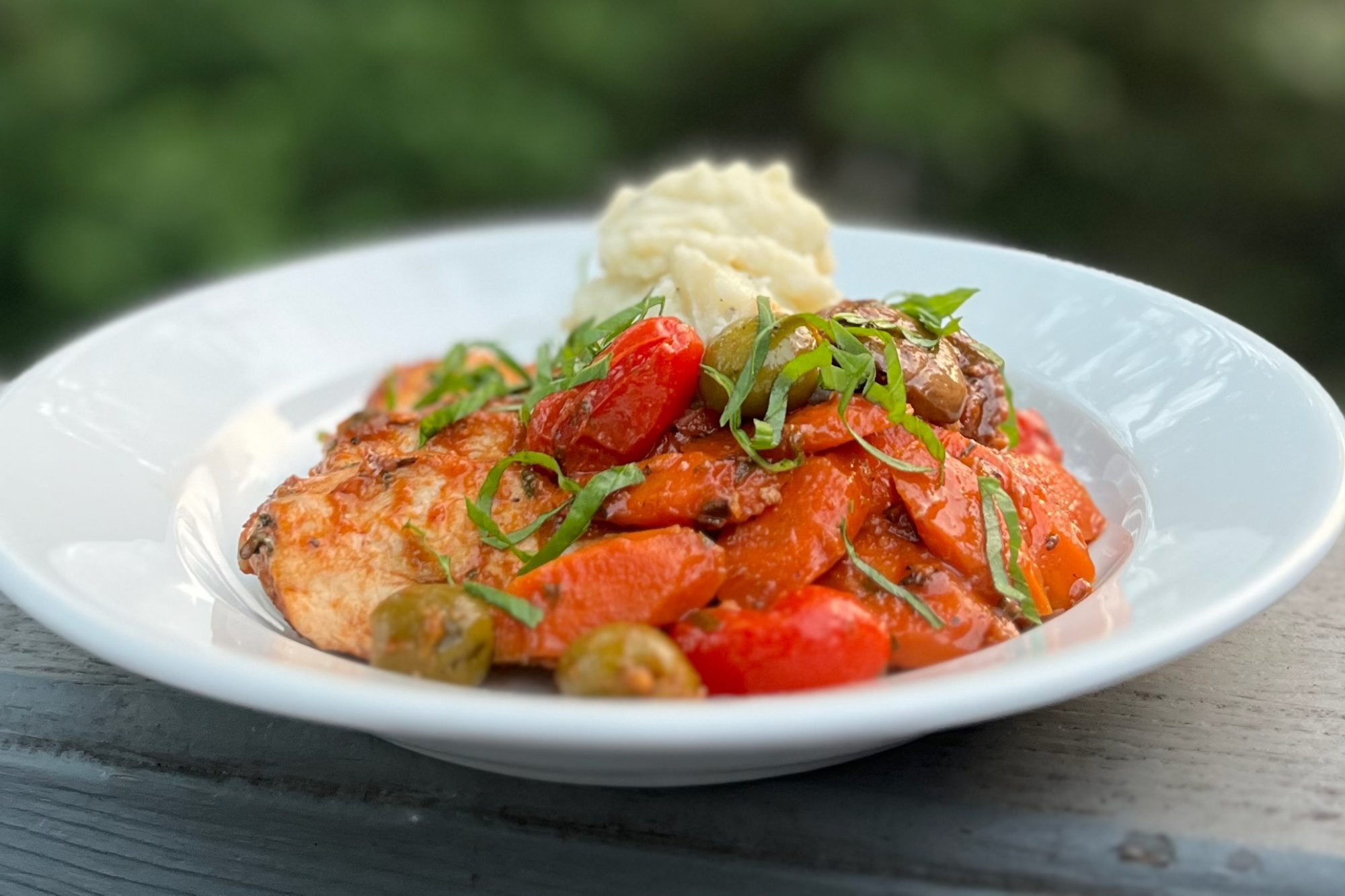 Tender chicken cooked with garlic, tomatoes, and herbs in a bright, Mediterranean-style sauce.